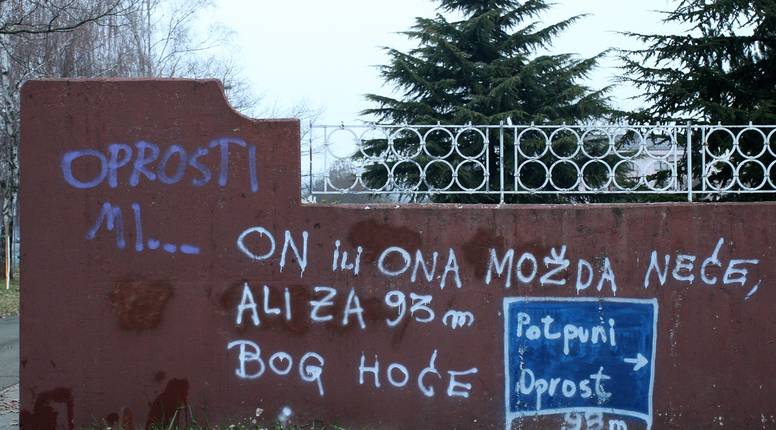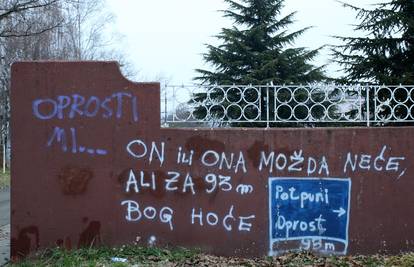 Na ogradi franjevačkog samostana i crkve u Aveniji Gojka Suska pojavio se odgovor na stariji grafit "Oprosti mi" i to "On ili ona možda neće, ali za 93 metra Bog hoće".