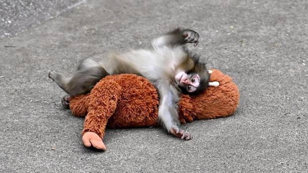 Činilo se da ima samo jednog prijatelja: malenu plišanu igračku orangutana iz IKEA-e, koju uporno vuče po svojoj nastambi i grli dok spava. Bebe japanskih makakija drže se za tijelo svoje majke odmah nakon rođenja kako bi izgradile mišićnu snagu.