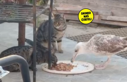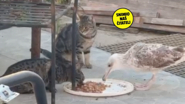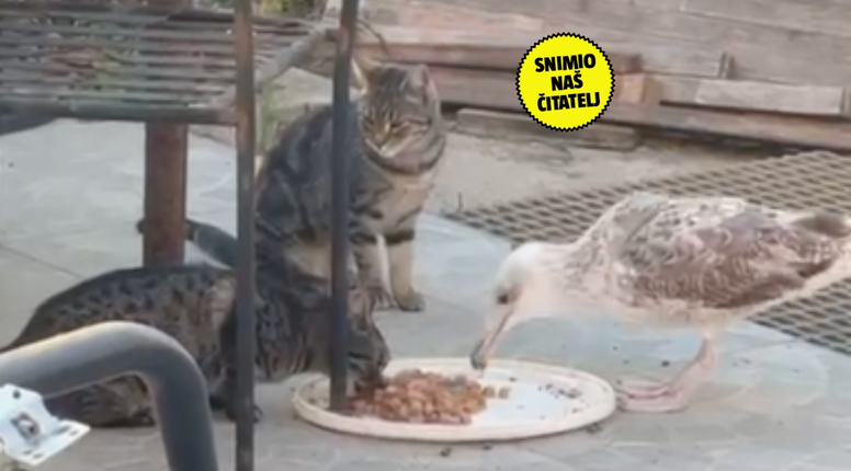 Jedan mladi galeb iz Splita uoči Uskrsa odlučio je pridružiti se grupi mačaka na ručku. Sve to djeluje kao potpuno nesvakidašnja situacija, no naš nam čitatelj javlja kako je riječ o galebu koji se već poprilično udomaćio. - Tu je već izvjesno vrijeme, a mi ovdje na poslu hranimo mačke pa tako hranimo i njega. Navikli su se već, malo ih on ponekad kljuca pa ih znamo držati podalje, ali inače je sve u redu. To je sad malo društvo. Na trenutke je malo prkosan pa pokaže zube, odnosno kljun, ali uglavnom sve funkcionira - govori nam čitatelj.