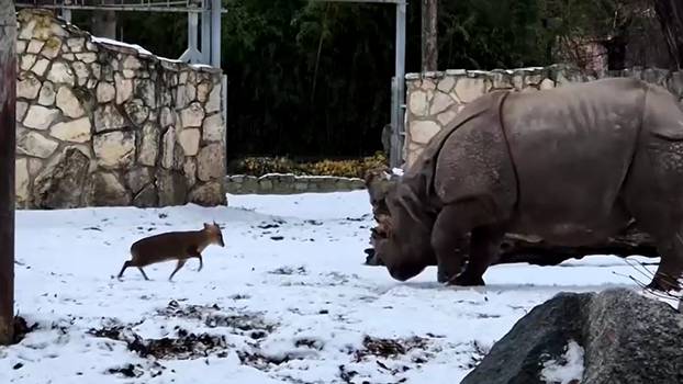 WROCLAW U lijevom kutu jelen muntjak težak 17 kilograma, u desnom kutu indijski nosorog težak 1660 kg. Neka borbe počnu! Tako bi ovaj 'dvoboj' najavili da je riječ o boksačkom meču. U ZOO-u u Wroclawu snimljen je viralni video u kojem se vidi kako nosorog bježi od malenog jelena imena Dad. "Nosorog je svjestan svoje veličine, nježan je. Za njega je ovo bila igra. Ali za jelena je ovo bila žestok sukob u kojem je obranio svoju partnericu", poručuju iz ZOO-a...