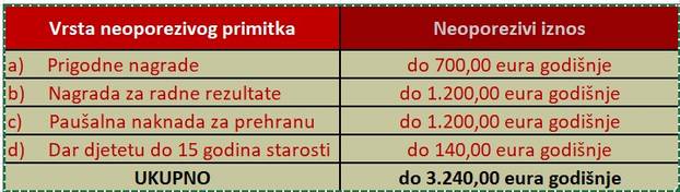 Tablica: Vrsta i iznos neoporezivog primitka