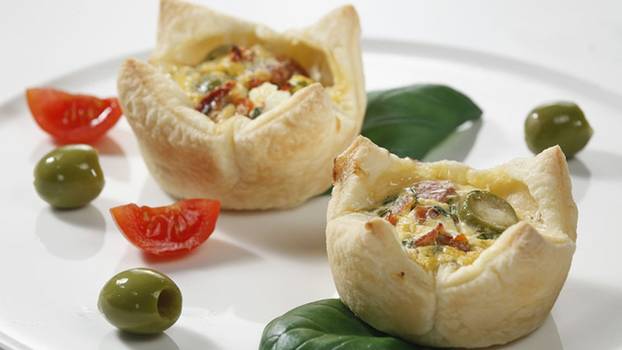 Tijesto tanko razvaljajte (44x33cm) i narežite na 12 kvadrata (11x11 cm). Tijesto rasporedite u kalupe za muffine. Jaja i slatko vrhnje razmutite. Dodajte narezanu sušenu rajčicu, na ploškice narezane masline, natrgani sir, narezani pršut i bosiljak. Pripremljenu smjesu rasporedite u lisnato tijesto. Pecite u pećnici zagrijanoj na 200 °C oko 25 minuta. Poslužite tople ili hladne.