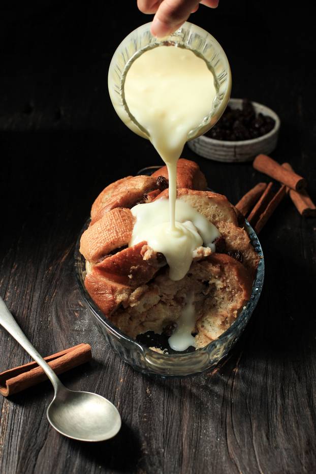 Potrebno vam je oko 200 g starog kruha narezanog na šnite, 50 g omekšalog maslaca, 4 žlice pekmeza okusa po želji, 60 g grožđica, 2 žumanjka, 2 jaja, 40 g šećera, 300 ml mlijeka, 300 ml slatkog vrhnja, liker po želji za aromu te šećer u prahu za posipanje.