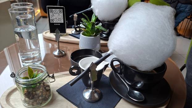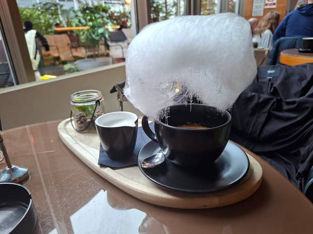Dosta vam je svega i najradije biste otišli popiti kavu među oblake? E pa ne morate ići daleko. Sličan 'experience' možete doživjeti ako se uputite u Michi Garden - Cocktail and Caffe bar na Bundeku. Oni u ponudi imaju takozvanu 'candy coffee', odnosno kavu s oblakom od šećerne vune koja izgleda itekako 'instagramično'. Cijena joj je 4,90 eura, a imaju hladnu i toplu varijantu. Mi smo izabrali toplu i malo je reći da smo se oduševili njenim izgledom. Kada smo je naručili, konobar nas je upozorio da trebamo pričekati 10-15 minuta jer sami rade šećernu vunu, na što smo odmah pristali.