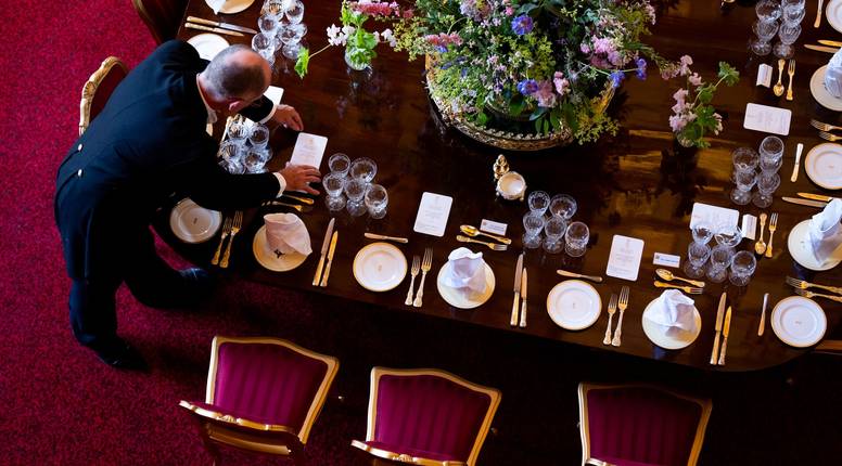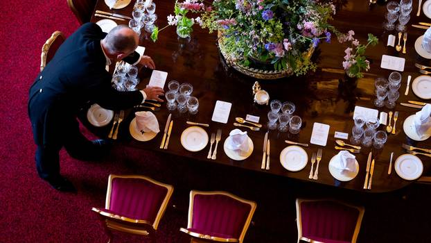 U Buckinghamskoj palači stol je tradicionalno postavljen u obliku potkove, s monarhom i počasnim gostom na vrhu. Stol krasi više od 100 svijeća u pozlaćenim svijećnjacima, sezonsko voće i raskošni cvjetni aranžmani.