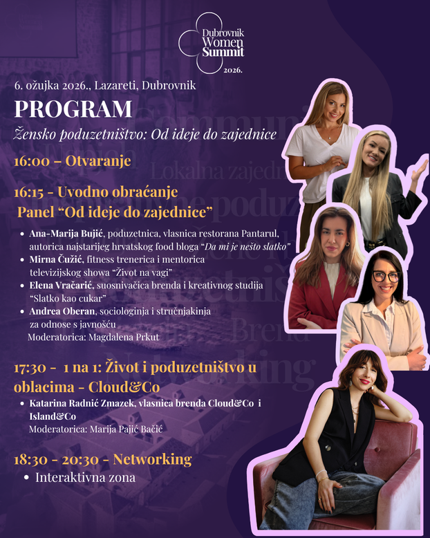 Povodom Dana žena, u petak 6. ožujka 2026. godine Grad Dubrovnik s ponosom najavljuje Dubrovnik Women Summit, događaj koji u središte stavlja žene poduzetnice, njihovu vidljivost, međusobnu podršku i izgradnju snažne poslovne zajednice. Ulaz je slobodan a vrata se otvaraju od 16 sati.