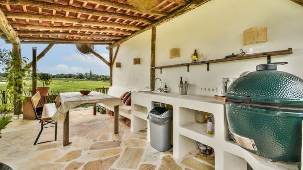 Prije svega, procijenite prostor koji možete odvojiti. Možda je to samo jedan kut terase, pa ćete u tom kutu postaviti samo roštilj ili malu peku na kotačima, uz jedan kuhinjski element u kojem ćete držati pribor i začine da vam budu pri ruci. Takav element možete izraditi od starih paleta, ili prilagodbom starog noćnog ormarića. Svakako dodajte i nekoliko polica sa strane roštilja, kako biste imali gdje odložiti tanjur s hranom koju ćete peći i jedan s onim što je pečeno. Nastojte da roštilj bude u kutu iz kojega dim ne ulazi u kuću i ne smeta za stolom za kojim jedete, a ako je tako, možda to možete riješiti - malim ventilatorom koji će ga tjerati na drugu stranu.