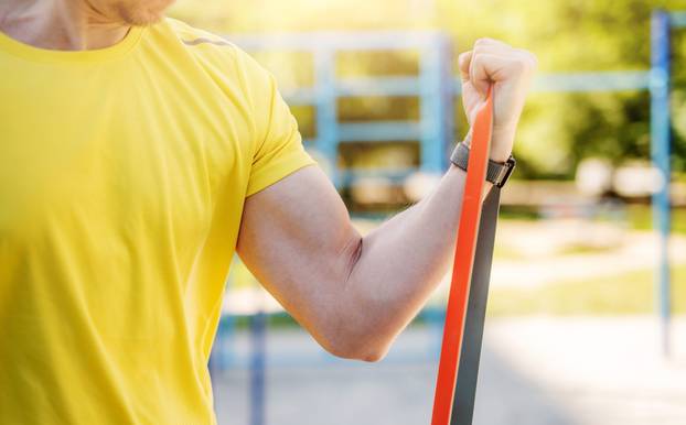 Stanite s nogama u širini ramena. Stavite traku ispod jednog stopala i držite krajeve u rukama, dlanovima okrenutima od tijela. Savijte ruke prema ramenima kroz oko 2 sekunde, zatim ih spuštajte 3 sekunde.