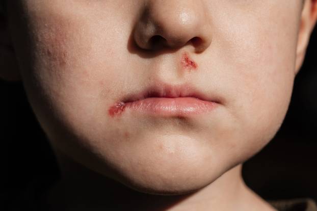 Vrlo zarazna bakterijska kožna bolest koja se obično nalazi na izloženim područjima poput lica i ruku. Posebno je česta kod beba i male djece. Prepoznat ćete ga po crvenkastim ranicama, često oko nosa i usta. Razvijaju se u mjehuriće ispunjene tekućinom koji, kada puknu, tvore žućkastu krastu.