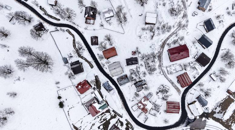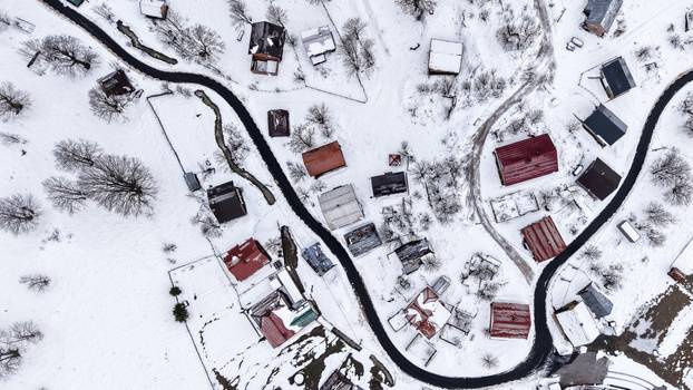 Zračni pogled otkriva netaknutu zimsku tišinu, u kojoj se bijeli pejzaž proteže preko planinskih padina i krovova kuća, naglašavajući surovost, ali i ljepotu ovog kraja