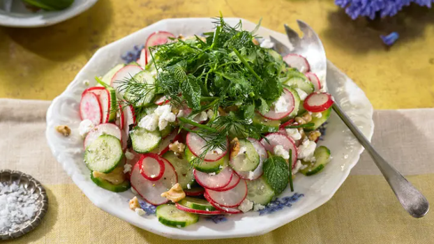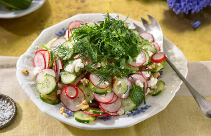 Priprema: Narezati krastavce i rotkvice na ploške, začiniti te dodati fetu i orahe.