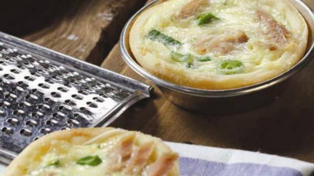Nadjev: Mladi luk očistite, operite i narežite na tanke kolutiće i pomiješajte s tunom, naribanim ementalerom i ravnomjerno rasporedite po oblicima tijesta u kalupima. Jaja razmutite, pomiješajte sa slatkim vrhnjem, Vegetom i žlicom rasporedite po nadjevu. Na kraju posipajte s naribanim parmezanom. Stavite u pećnicu zagrijanu na 200 °C i pecite 25 minuta. Poslužite uz bogatu ljetnu salatu od rajčica, krastavca, luka, graha i kukuruza šećerca.