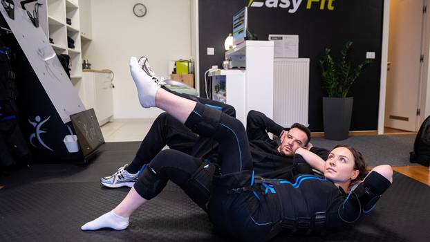 U našem studiju treniramo u odijelu kakvo su u svemir nosili astronauti, kako im u bestežinskom stanju mišići ne bi propali. Većina početnika ima mali strah od odijela sa strujom, ali ga brzo prebrode kad vide da je u potpunosti bezopasno. Što je najvažnije - štedi vrijeme i traje samo 15 - 20 minuta, priča nam trener Davor Ilić iz Easy fit studija. EMS trening na našim prostorima tek postaje popularan, a sve vježbe rade se u odijelu s elektrodama. Električni impulsi povećavaju kontrakcije mišića tijekom izvođenja vježbi pa je, kaže Davor, 15 minuta EMS treninga jednako kao čak jedan sat običnog vježbanja.