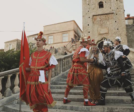 Nasreću, da biste bezbrižno uživali u ovoj sceni, ne trebate ni vremeplov ni antibiotike širokog spektra. Zaplovite li put Korčule, nije nemoguće da naiđete na slične prizore diljem otoka jer je Korčula poznata po bojnim plesovima s mačevima, odnosno viteškim igrama poput moreške i kumpanjije.