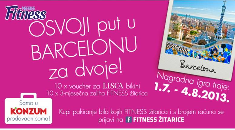 Koje je vaše odredište za ljetovanje ove godine? Kulturna bogatstva, bogat noćni život, atraktivne plaže, raj za shopping… zvuči zanimljivo? Nestlé FITNESS vas vodi u Barcelonu! Kupite kutiju vaših omiljenih Nestlé FITNESS žitarica u Konzum prodavaonicama u periodu od 1.srpnja do 4.kolovoza, sačuvajte račun i prijavite se na FITNESS žitarice Facebook stranicu.