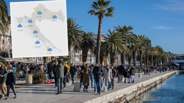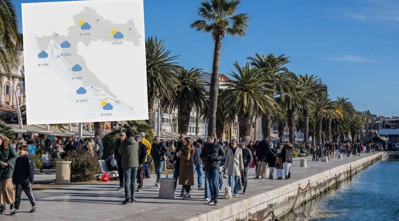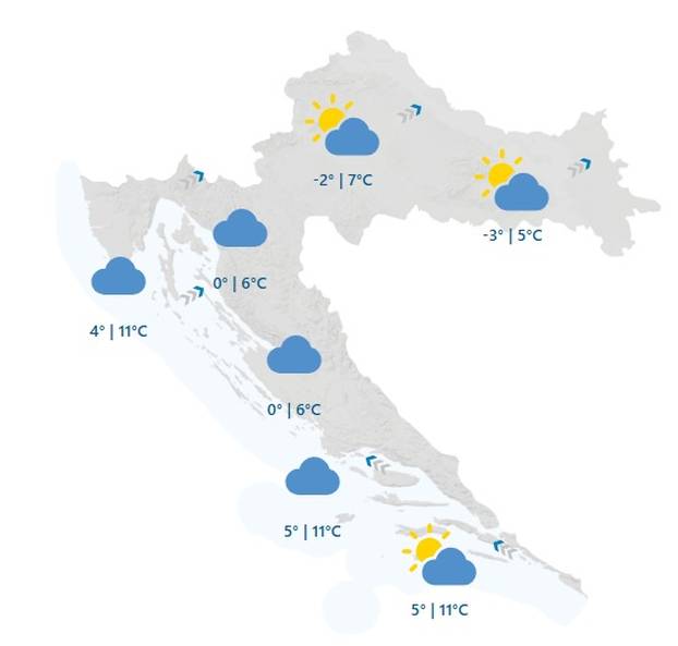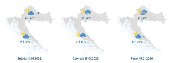 - Umjereno, ponegdje i pretežno oblačno. Malo kiše je moguće na sjevernom Jadranu te u Gorskom kotaru i Lici. Vjetar slab do umjeren jugozapadni i zapadni, u gorju i jak, a na Jadranu i jugo. Najniža jutarnja temperatura uglavnom od -4 do 1, na Jadranu 2 do 7, a najviša dnevna između 4 i 9, na Jadranu 8 i 13 °C - stoji u prognozi DHMZ-a za utorak, 13. siječnja.