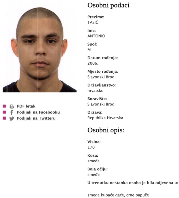 Na stranici nestali.hr objavljeni su podaci o mladići.