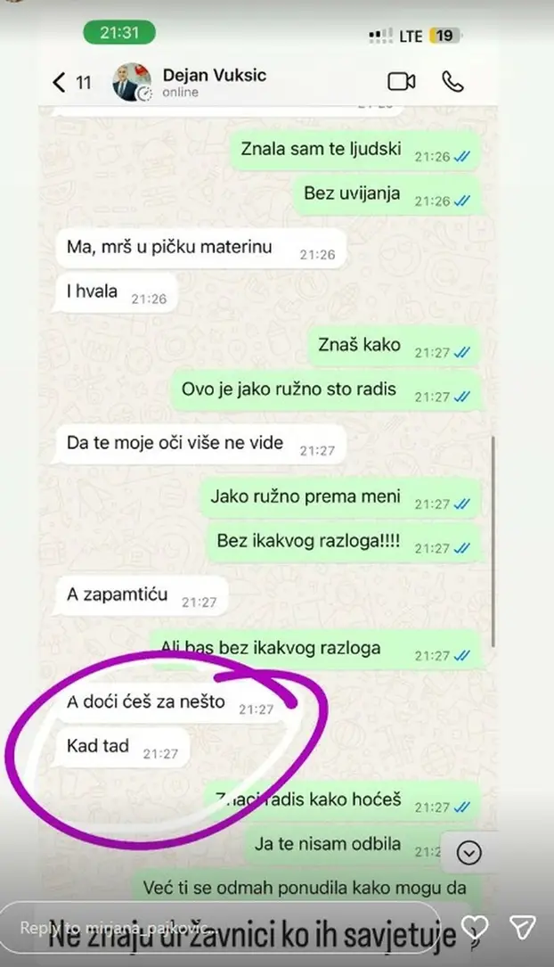 Prepiska sadrži i poruke poput: "Ma, mrš u pi*ku materinu. I hvala", na što mu ona odgovara da je ružno to što radi, a on uzvraća: "Da te moje oči više ne vide", te dodaje: "A doći ćeš još za nešto. Kad tad."