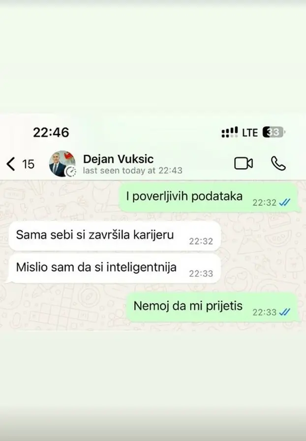 U jednoj od objavljenih poruka Vukšić joj piše: "Sama si završila karijeru" i "Mislio sam da si inteligentnija", na što ona odgovara: "Nemoj da mi prijetiš".
