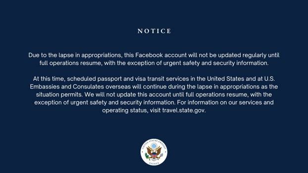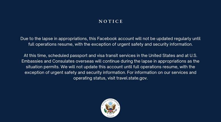 Objavili su to na službenim Facebook stranicama američke ambasade u Zagrebu. Rezultat je to, naime, blokade savezne Vlade SAD-a, zbog kojih se sve, osim hitnih službi, stavlja u mirovanje. Naime, to je izazvalo prestanak rada administracije, koja mora na prisilni godišnji odmor. On nije plaćen, a garancija, kad bi mogli dobiti plaću - nema.