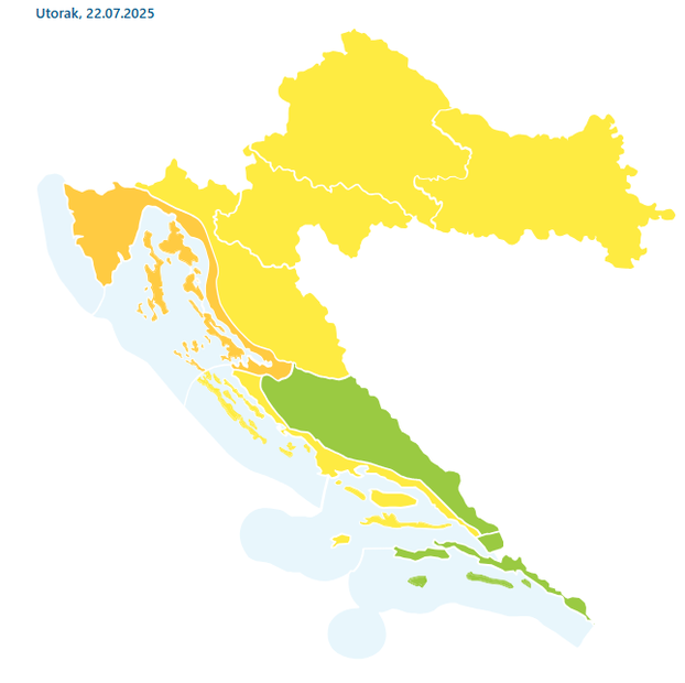 U utorak nas u Dalmaciji očekuje sunčano i vruće vrijeme, s najvišim dnevnim temperaturama između 29 i 34 stupnja Celzijeva. U ostalim dijelovima zemlje bit će promjenljivo oblačno i nestabilno, uz mogućnost lokalnih pljuskova s grmljavinom, osobito u unutrašnjosti. Poslijepodne se očekuje smanjenje naoblake.