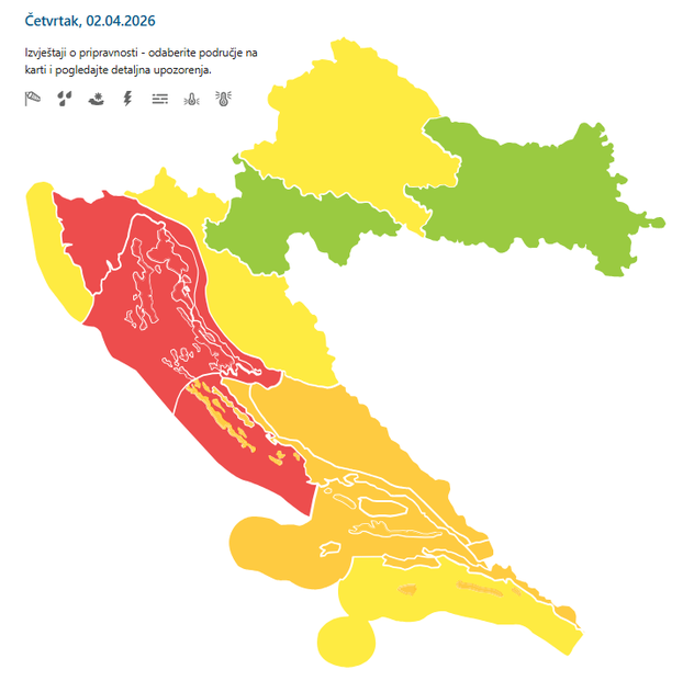 Izdali su narančasto upozorenje za Kninsku, Splitsku i Dubrovačku regiju te za Srednju Dalmaciju, jer vrijeme opasno zbog jakog vjetra. Za petak izdano je crveno upozorenje za Velebitski kanal, a narančasto za Riječku regiju te za Kvarner i Kvarnerić.