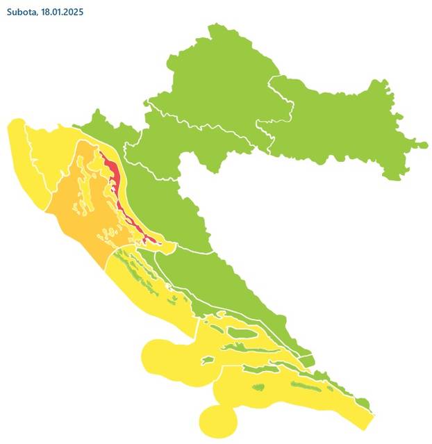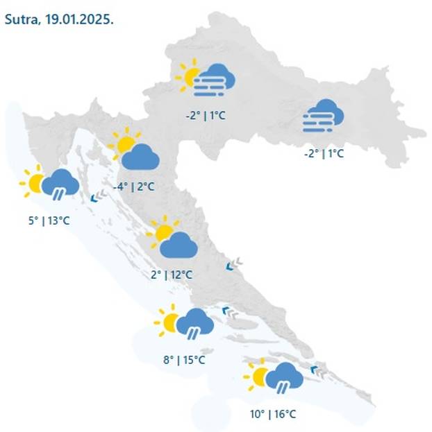 - U subotu u Slavoniji, Baranji i Srijemu većinom oblačno, ujutro ponegdje magla, a poslijepodne uglavnom na sjeveru moguća su sunčana razdoblja. Temperatura zraka i dalje većinom između -2 i 2 °C. U središnjoj Hrvatskoj prijepodne također pretežno oblačno, a od sredine dana raste vjerojatnost za sunčana razdoblja na sjeveru i u višem gorju. Najniža temperatura između -4 i -1 °C, a najviša dnevna od 1 do 3 °C, uz sunčanije vrijeme viša. Najviše sunčanih sati bit će na sjevernom Jadranu, ali i dalje vjetrovito uz jaku, na udare olujnu buru te umjereno valovito i valovito more. U Gorskoj Hrvatskoj umjereno do pretežno oblačno, po kotlinama moguća magla, a od sredine dana češća sunčana razdoblja, osobito u višim predjelima. Jutro hladno, u gorju i unutrašnjosti Istre oko -5 °C, uz more od 1 do 6 °C, a najviša temperatura od -1 do 2 °C, na sjevernom Jadranu i unutrašnjosti Istre od 9 do 14 °C. Pretežno sunčano bit će na srednjem Jadranu i u unutrašnjosti Dalmacije, a potkraj dana rast naoblake, osobito na otocima. Puhat će umjerena i jaka bura. Najviša poslijepodnevna temperatura zraka između 13 i 16 °C, ali jutro u unutrašnjosti hladno. I na jugu Hrvatske razmjerno toplo danju, ali ujutro u unutrašnjosti hladno uz temperaturu oko 0 °C. Prevladavat će sunčano, prema večeri će se s juga naoblačiti, a u noći može pasti malo kiše, uglavnom na otocima. Puhat će umjerena do jaka bura, prognozirala je za HRT Dunja Plačko-Vršnak, dipl. ing..