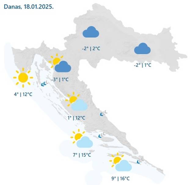 Vjetar većinom slab, na Jadranu slaba i umjerena, mjestimice jaka bura, podno Velebita na udare olujna. Najviša dnevna temperatura između -2 i 3, na Jadranu od 12 do 17 °C, javlja DHMZ.