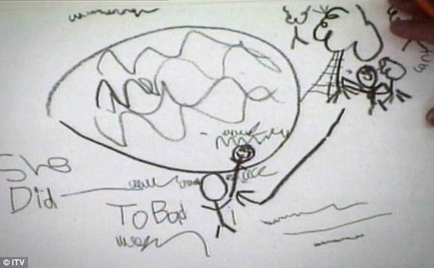 Na sudu su ga tražili da opiše crteže koje je nacrtao. Dječak je rekao: 'Ovo je moja mama. Ubija moju sestru.' Kada je tužitelj dječaka pitao kako je to napravila, dječak je rekao: 'Stavila joj je ruku na lice.'