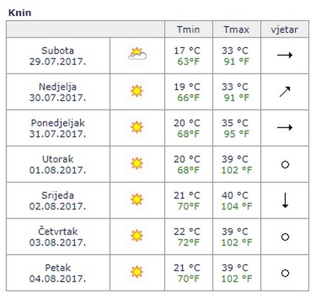 Od ponedjeljka temperature dodatno rastu te će cijeli sljedeći tjedan biti vruće, posebno na istoku zemlje i u unutrašnjosti Dalmacije. Kako sada pokazuju meteorološke karte, temperaturni rekord bi mogao oboriti Knin gdje bi u srijedu moglo biti 40 °C u hladu.