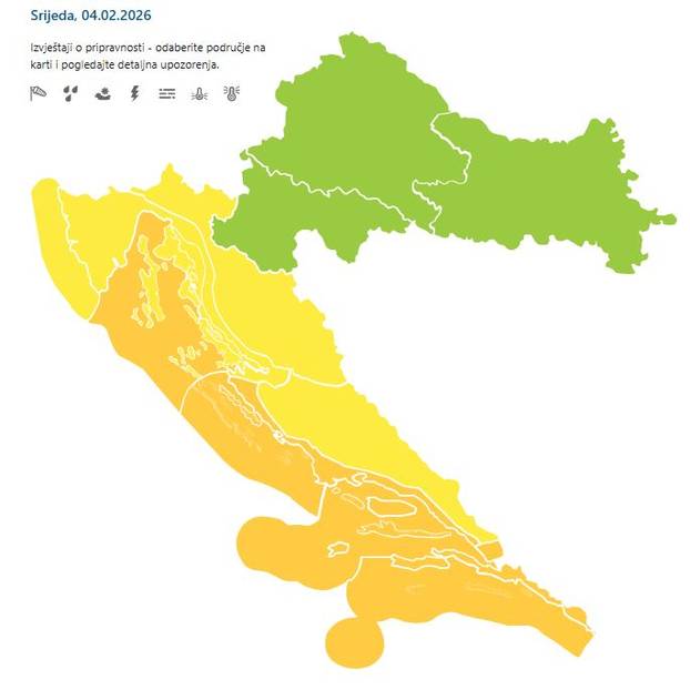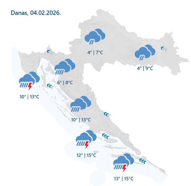 Vjetar će u unutrašnjosti biti slab do umjeren, sjeveroistočni i jugoistočni, dok će u Gorskoj i istočnoj Hrvatskoj povremeno biti i jakih udara. Na Jadranu će prevladavati umjereno do jako jugo, a u Dalmaciji se očekuju i olujni udari juga, što će dodatno pojačati osjećaj nestabilnosti i hladnoće.