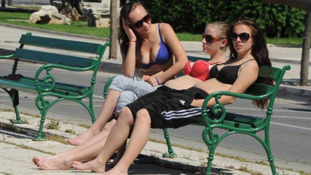 Tri mlade Čehinje raskomotile su se u utorak na rivi u Šibeniku te "hvatale" zrake sunca i znatiželjne poglede. Inače u Šibeniku je u 11 sati, kada su Čehinje i snimljene, bilo 23 stupnja Celzija.