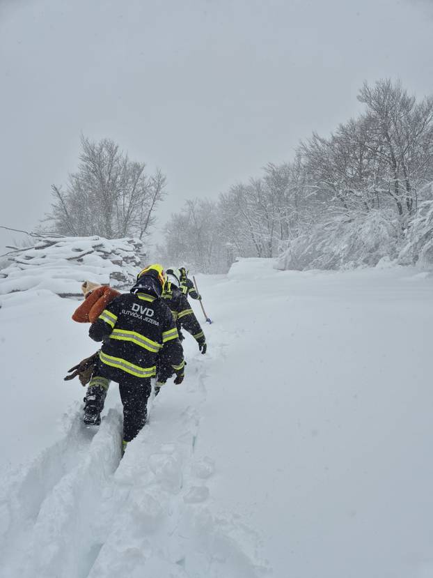 Zbog visokog snijega, koji je na mjestima bio visok preko 80 centimetara, vatrogasci su se dva kilometra pješice probijali kroz šumski put do zametene obitelji.