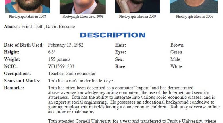 Muškarac je poznat i kao David Bussone, a od 2008. godine nitko ne zna gdje je. Nakon bijega osuđen je u Washingtonu i Marylandu zbog dječje pornografije. FBI je u utorak objavio njegove fotografije i tjeralicu. Opisali su ga kao kompjuterskog eksperta, koji se posebno razumije u internet. Za bilo kakvu informaciju o bjeguncu nude nagradu od 100.000 dolara.