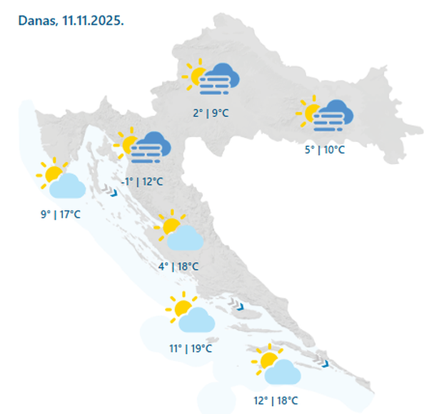 Na sjevernom Jadranu pretežno sunčano. U gorskoj Hrvatskoj prijepodne tmurno i oblačno, mjestimice s maglom, a poslijepodne barem ponegdje i sunčana razdoblja.