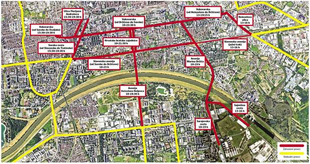 Sajmišna cesta bit će zatvorena od 13 do 16, Andrašeca i dio Vukovarske kraj Savske od 15.30 do 19.30. Savska cesta između Tratinske i Slavonske od 17 do 19. Slavonska avenija (oba kolnika) između Savske i Držićeve zatvorena je od 18 do 23.