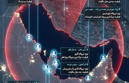 Na grafici na perzijskom jeziku stoji poruka "Recite zbogom struji". Na ilustraciji je prikazana karta Perzijskog zaljeva s označenim velikim elektranama i energetskim postrojenjima u državama poput Saudijske Arabije, Katara, Ujedinjenih Arapskih Emirata i Bahreina, uz navode o njihovoj vrsti i kapacitetu.