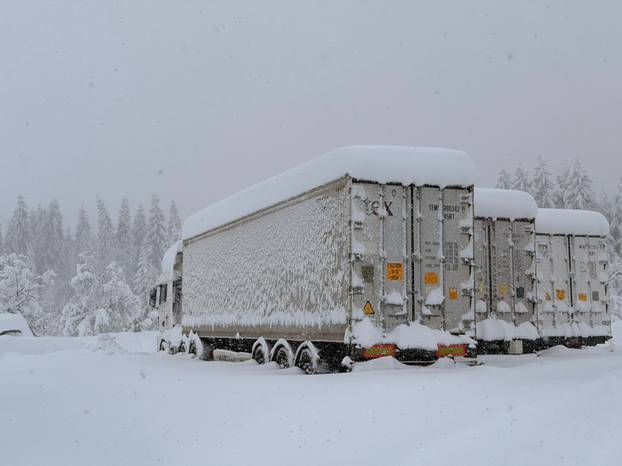 Zbog snijega i zimskih uvjeta vožnje u Gorskom kotaru i Lici ograničenja su za kamione s prikolicama i tegljače s poluprikolicama, a pojedine državne ceste su zatvorene za sav promet, rekao je HAK