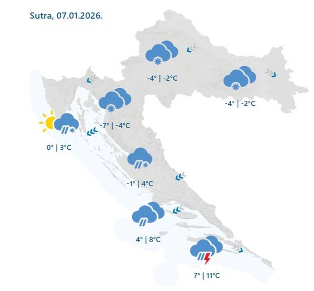 - Oblačno. U unutrašnjosti će još povremeno padati snijeg. Na Jadranu kiša, na jugu moguće obilnija i praćena grmljavinom, a na sjevernom dijelu te u unutrašnjosti Dalmacije moguća je susnježica ili snijeg. U unutrašnjosti Dalmacije ujutro i prijepodne kiša se može smrzavati u dodiru s hladnom podlogom. Prema večeri sa zapada postupno razvedravanje. Vjetar slab do umjeren sjeverni i sjeveroistočni, na istoku sjeverozapadni. Na Jadranu bura, umjerena i jaka s olujnim, podno Velebita i orkanskim udarima, a na krajnjem jugu i prema otvorenom moru poslijepodne će zapuhati sjeverozapadnjak. Temperatura zraka od -6 do -1 °C, a na Jadranu uglavnom od 5 do 10 °C, na sjevernom dijelu mjestimice osjetno niža - stoji u prognozi DHMZ-a za srijedu, 7. siječnja.