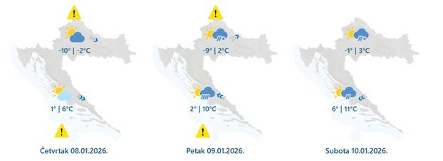 - U unutrašnjosti u četvrtak prolazno smirivanje i mnogim predjelima barem djelomice sunčano. U petak novo naoblačenje sa zapada te mjestimice kiša koja se lokalno može i smrzavati pri tlu, dok će u Gorskoj Hrvatskoj biti susnježice i snijega. I u subotu mjestimice oborine na granici kiše i snijega, a u gorju uglavnom snijeg. U četvrtak će puhati umjeren sjeverozapadni vjetar, a u petak jugozapadnjak, u gorju i jak. Jutra u četvrtak i petak iznimno hladna, a u subotu ujutro osjetno manje hladno. Od petka maksimalna temperatura zraka iznad 0 °C. Na Jadranu u četvrtak pretežno sunčano, a zatim promjenljivo oblačno mjestimice s kišom. ponegdje u Dalmaciji potkraj petka i u prvom dijelu subote i obilnijom. U četvrtak će puhati umjeren do jak sjeverozapadni vjetar, u petak pak umjereno do vrlo jako jugo, a u subotu će okrenuti na jaku buru. Jutra hladna, pa je u četvrtak i petak na sjevernom dijelu moguć i mraz. Već u petak maksimalna temperatura zraka osjetno viša, a u subotu i minimalna - pišu iz DHMZ-a.