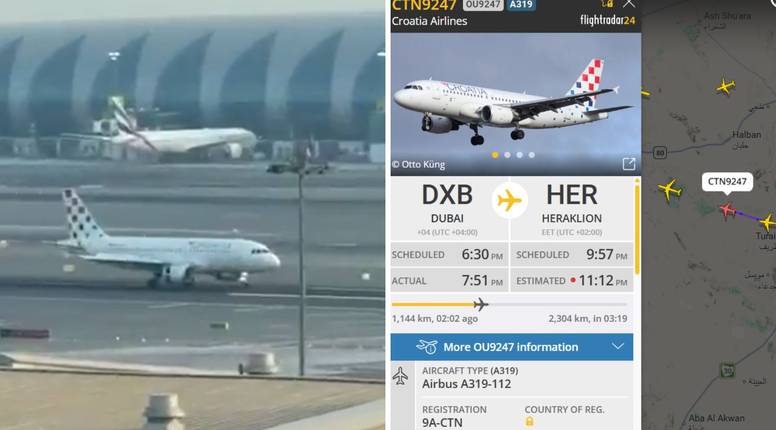 Zrakoplov Croatia Airlinesa, koji u Zagreb stiže preko Herakliona u Grčkoj, poletio je iz Dubaija oko 19.51 sati po lokalnom vremenu, gotovo sat i pol od planiranog. U glavni grad trebao je sletjeti oko 23.40 sati po Hrvatskom vremenu, no s obzirom na kašnjenje, sve je prolongirano.
