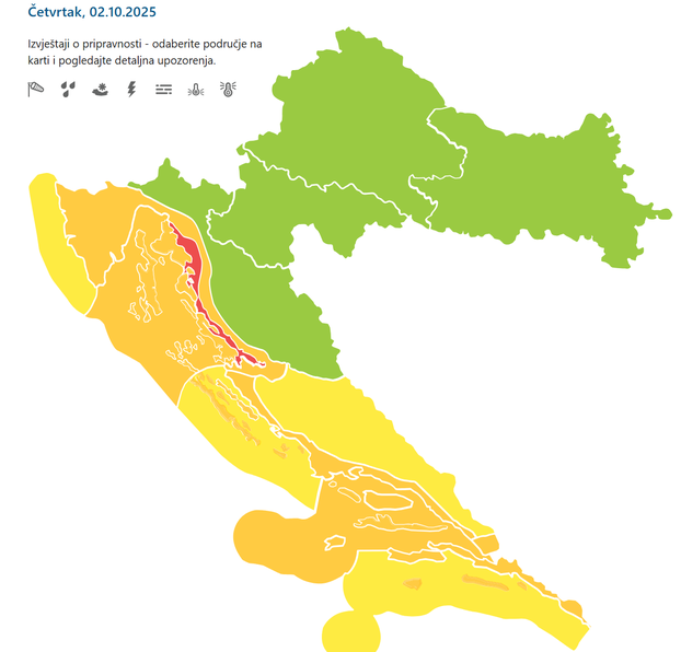 DHMZ je za četvrtak izdao crveno upozorenje za Velebitski kanal zbog olujnog vjetra te narančasto za riječku, splitsku i dubrovačku regiju kao i za Kvarner i srednju Dalmaciju. Žuto upozorenje zbog vjetra izdali su za kninsku regiju, sjevernu i južnu Dalmaciju te za zapadnu obalu Istre.