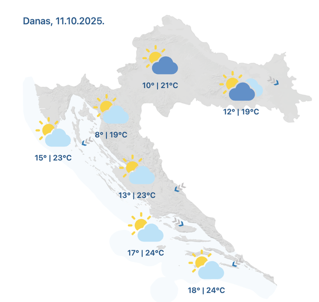 Nedjelja će donijeti nastavak stabilnog vremena. Bit će pretežno sunčano, uz povremenu umjerenu naoblaku u unutrašnjosti i lokalnu jutarnju maglu. Vjetar će većinom biti slab, na istoku do umjeren sjeverozapadni. Na Jadranu će puhati mjestimice umjerena bura, a poslijepodne će se okretati na sjeverozapadni i jugozapadni vjetar uz obalu.
