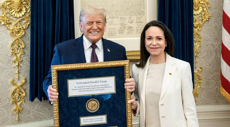 A sad, opozicijska liderica iz Venezuele Maria Corina Machado darovala mu je Nobelovu nagradu kako bi od predsjednika koji je nedavno napao njezinu zemlju, ubio 80 građana Venezuele, oteo njezina predsjednika, kao i milijune barela nafte (od čega je zaradu spremiio na svoj račun u katarskoj banci), dobila blagoslov da preuzme vlast.