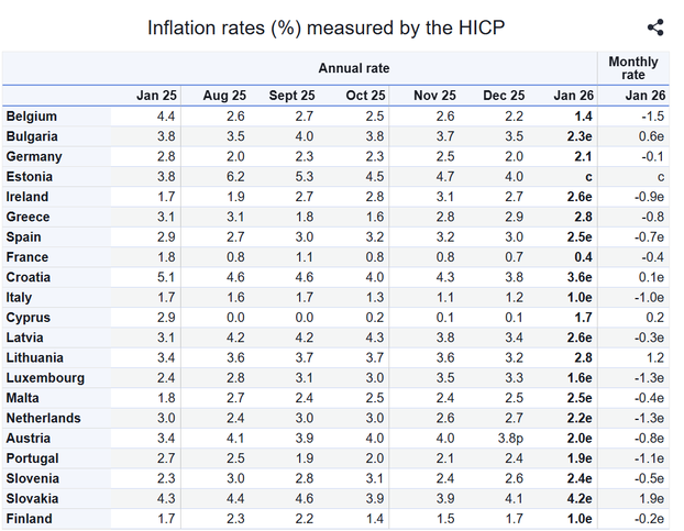 U cijeloj eurozoni prosječna godišnja stopa inflacije u siječnju 2026. iznosila je 1,7 posto, a po prvi puta je objavljena i procjena za Bugarsku, koja je od ove godine nova članica eurozone, a u kojoj su cijene u siječnju na godišnjoj razini u prosjeku bile veće za 2,3 posto.
