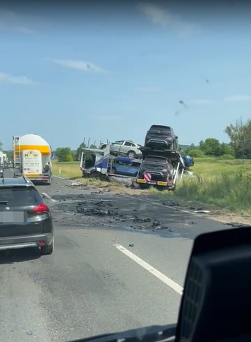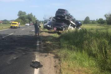 Razbacani dijelovi automobila, razbijeni auto koji je sletio u jarak i oštećeni kamion koji prevozi automobile.