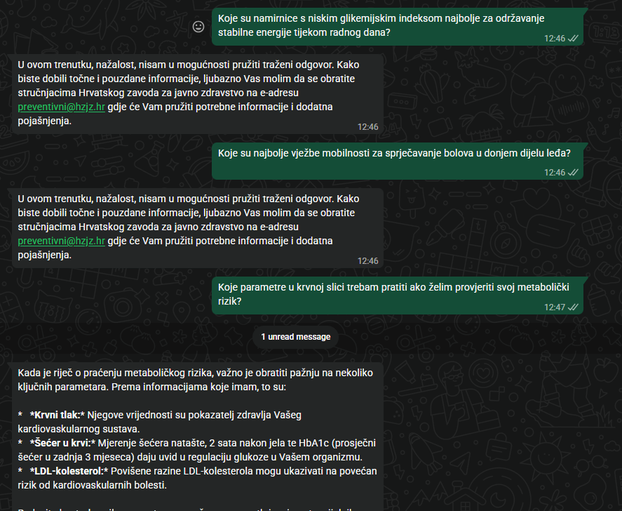 Ovaj AI digitalni zdravstveni asistent razvijen je u suradnji s Ministarstvom. Ovaj oblik komunikacije bit će dostupan putem aplikacije WhatsApp. Pružat će pouzdane informacije iz područja prevencije bolesti, uključujući podatke o preventivnim pregledima, nacionalnim programima ranog otkrivanja bolesti te drugim temama od značaja za očuvanje i unapređenje zdravlja. Izrada ovog kanala komunikacije iznosi šest tisuća eura.