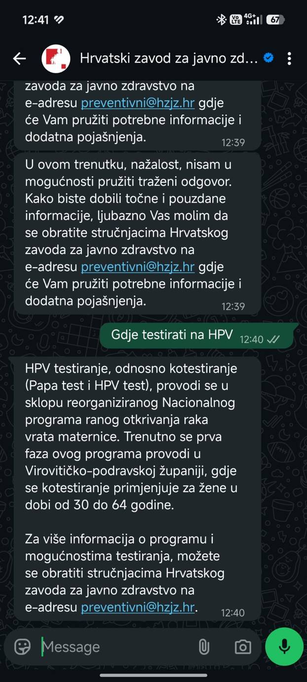 Postavili smo mu nekoliko pitanja o prevenciji bolesti, no ZdrAVKO nije odgovarao na pitanja. Nije odgovorio čak niti na pitanje za koje je pomoćnik ravnatelja Benjak rekao da će uputiti na mail ili na obiteljskog doktora. Nakon  nekoliko upita, dobili smo dogovor da ne može pružiti traženi odgovor.  Pitali smo ga o testiranju na HPV i tu smo dobili odgovor.