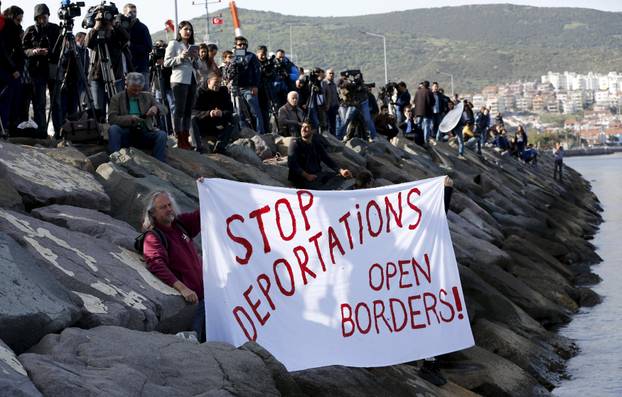 Mala skupina prosvjednika na Lezbosu uzvikivala je "Sram vas bilo!" kada su migranti ukrcani u brod i razvila je plakat na kojemu je pisalo "Zaustavite deportacije".
