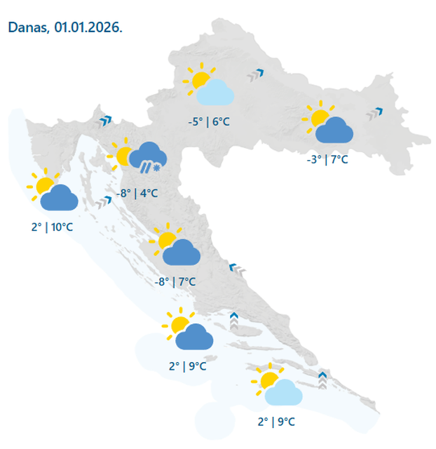 Hrvatska je prvi dan nove godine dočekala s izrazito niskim temperaturama u cijeloj zemlji, uz raširen mraz i temperature duboko ispod ništice u unutrašnjosti, dok je na Jadranu bilo osjetno blaže, ali i dalje svježe za početak siječnja.